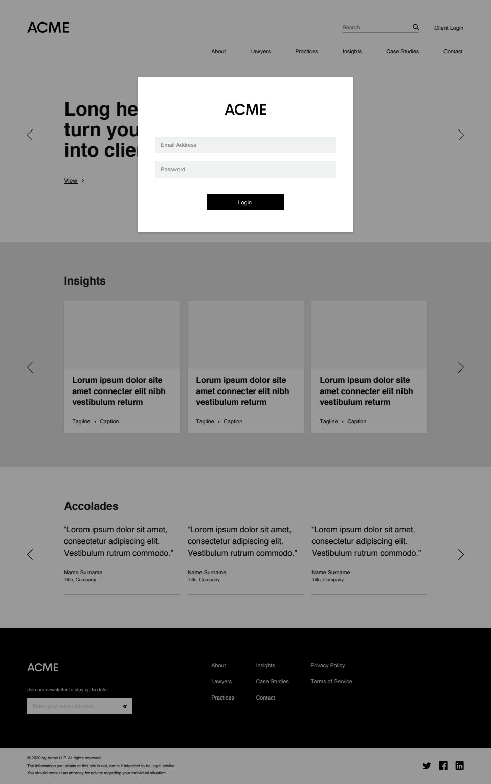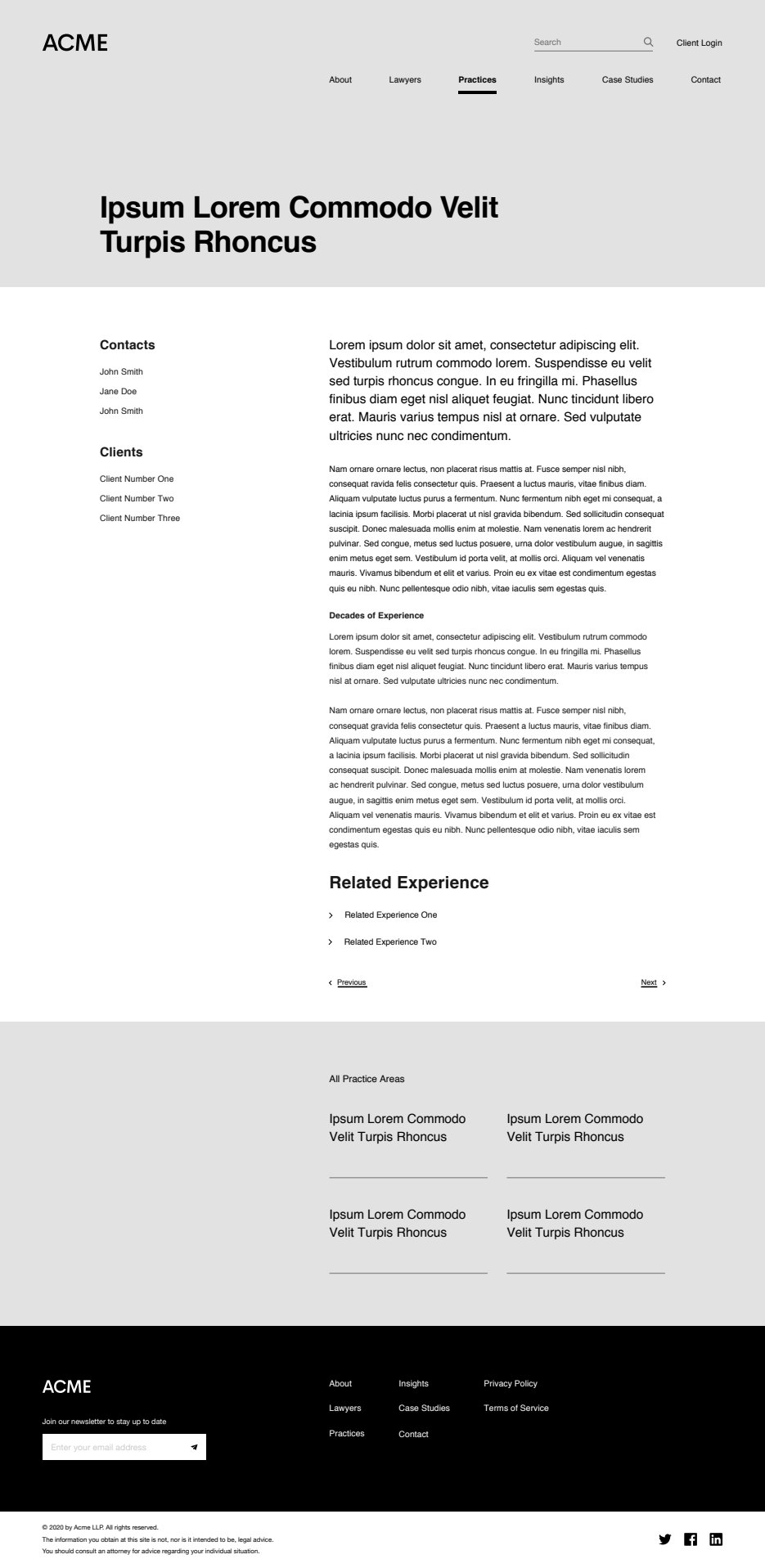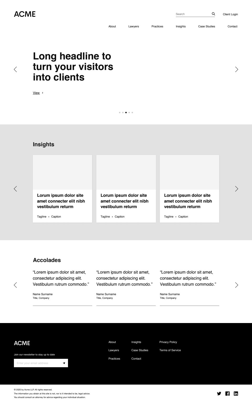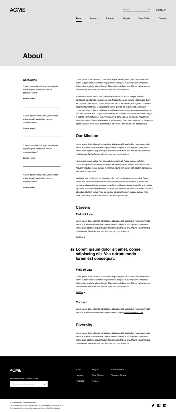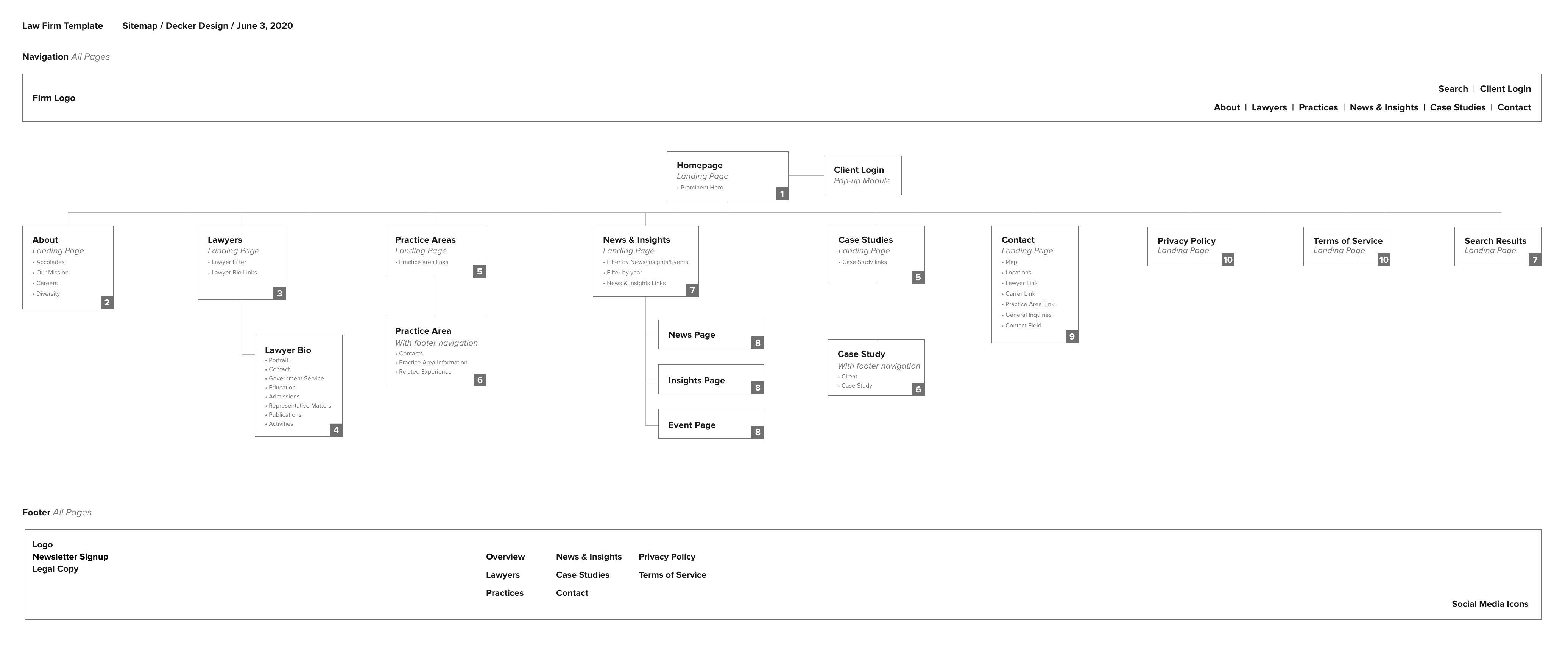 Sitemap and Wireframe process for an out of the box website product for small to midsize law firms. The idea is to provide a quality website that has baked in customization options, levels of complexity, and interchangeable pages/content.