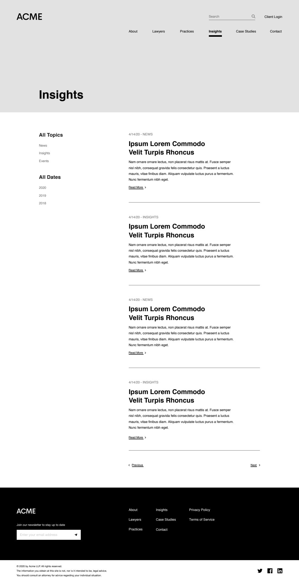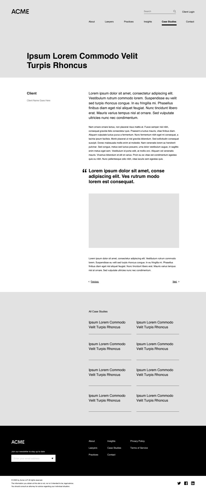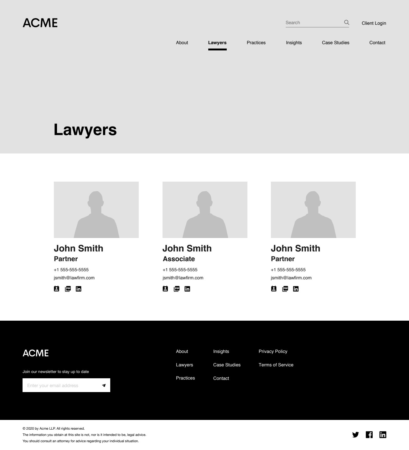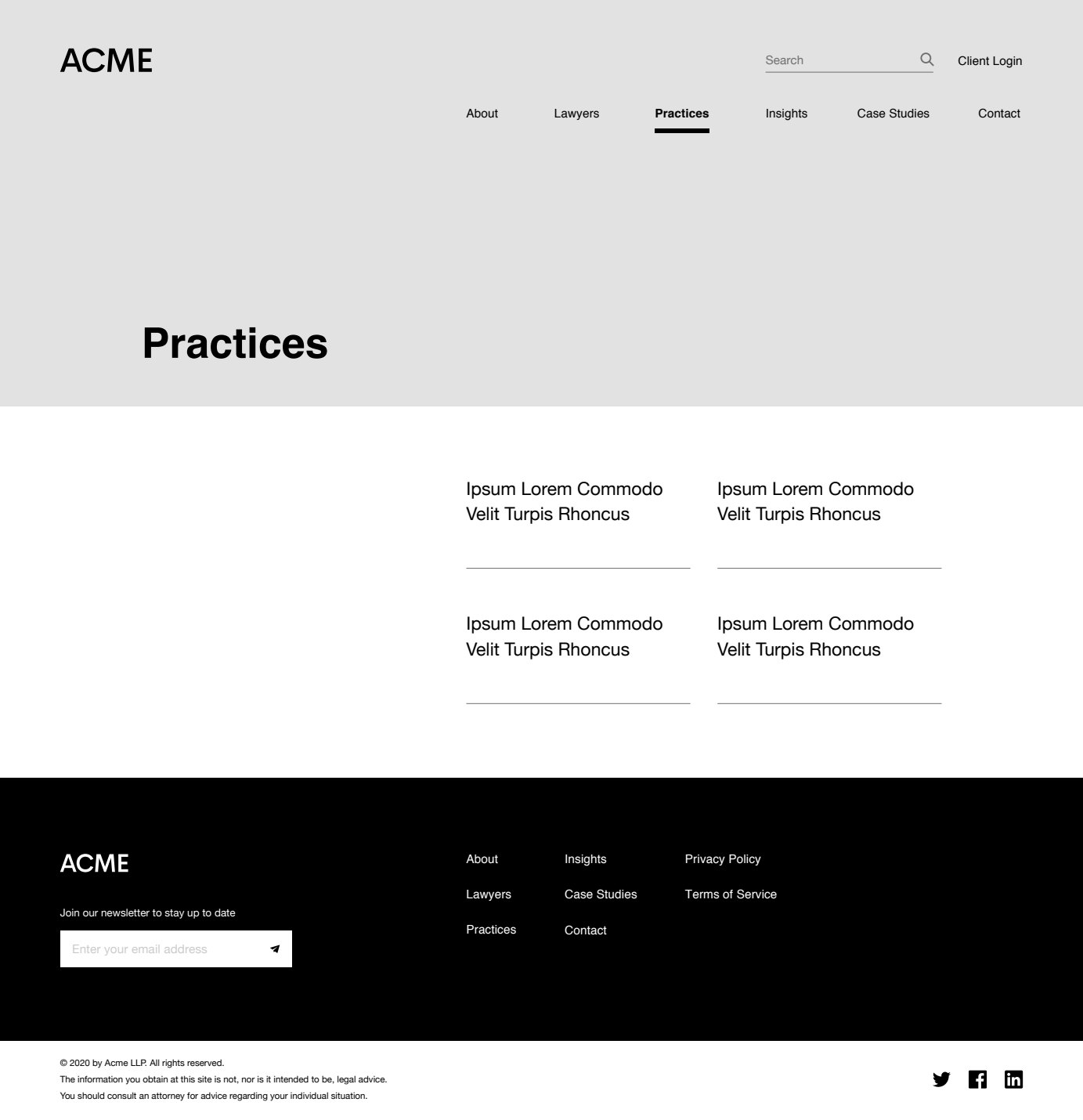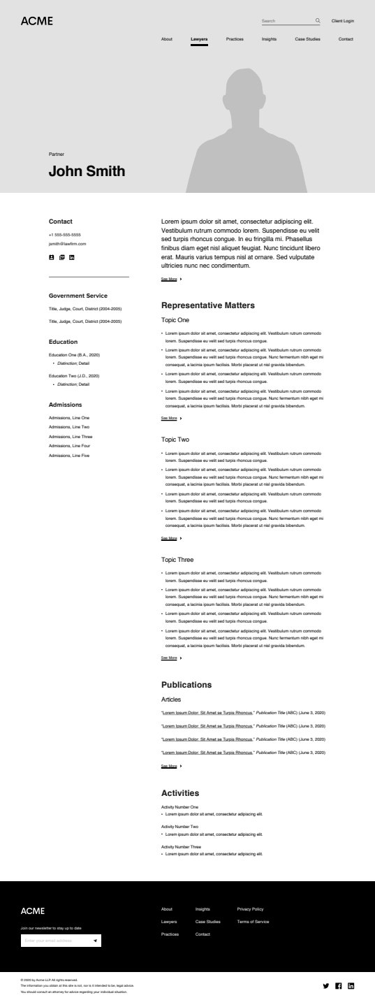 Sitemap and Wireframe process for an out of the box website product for small to midsize law firms. The idea is to provide a quality website that has baked in customization options, levels of complexity, and interchangeable pages/content.