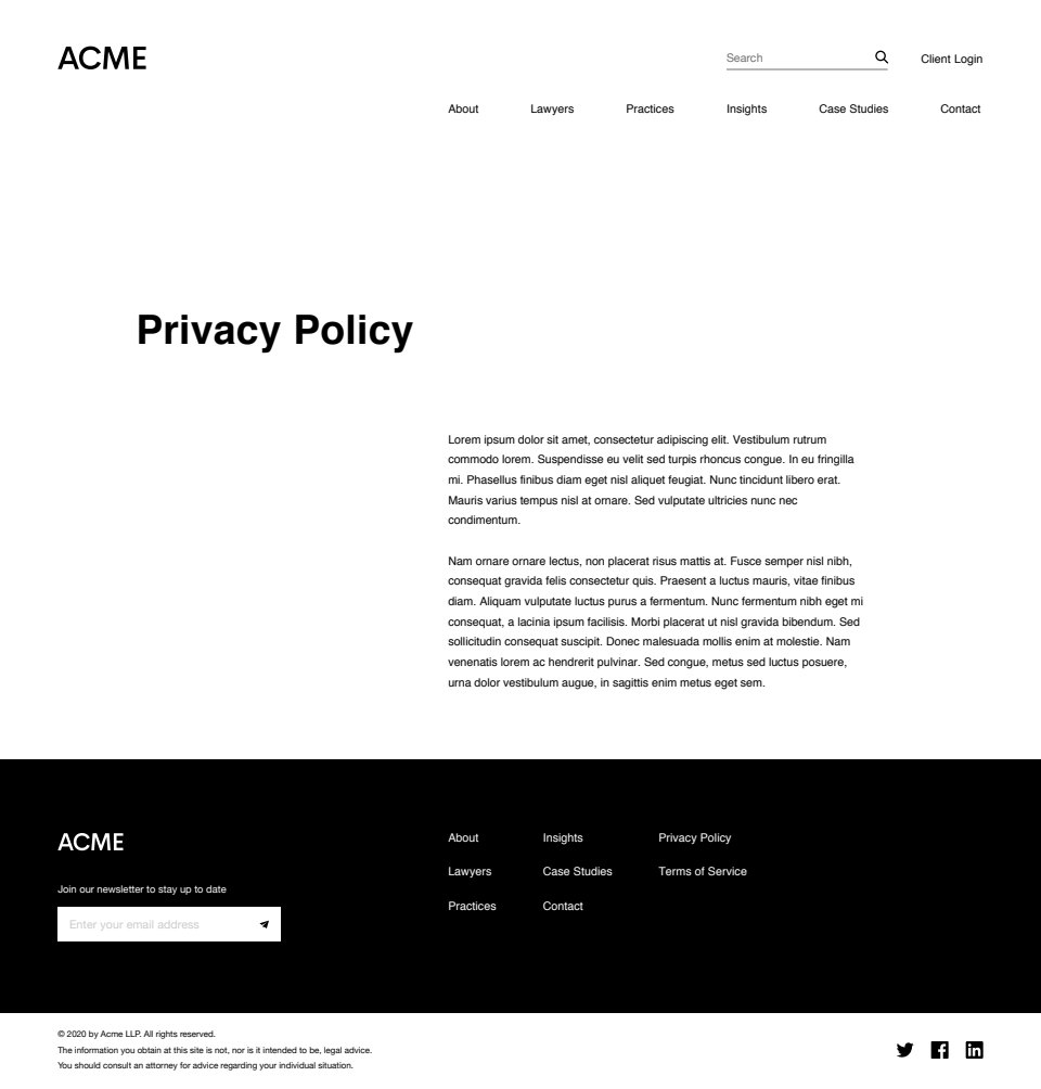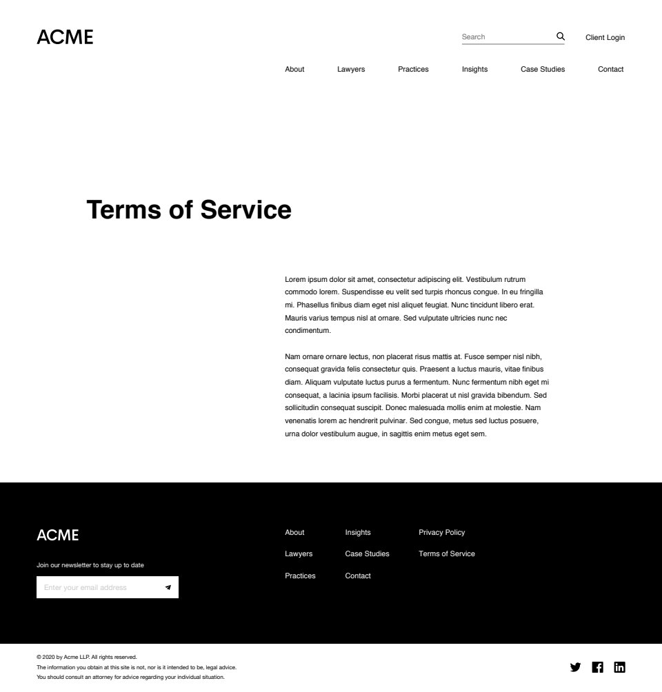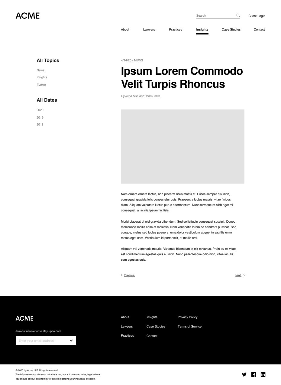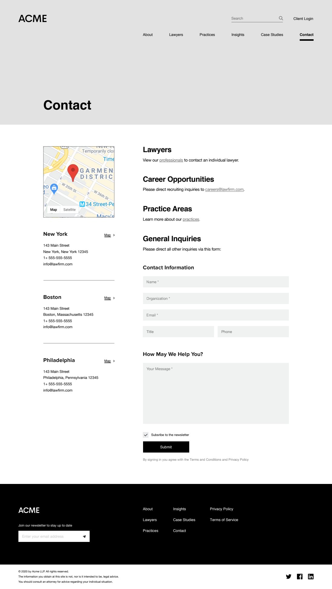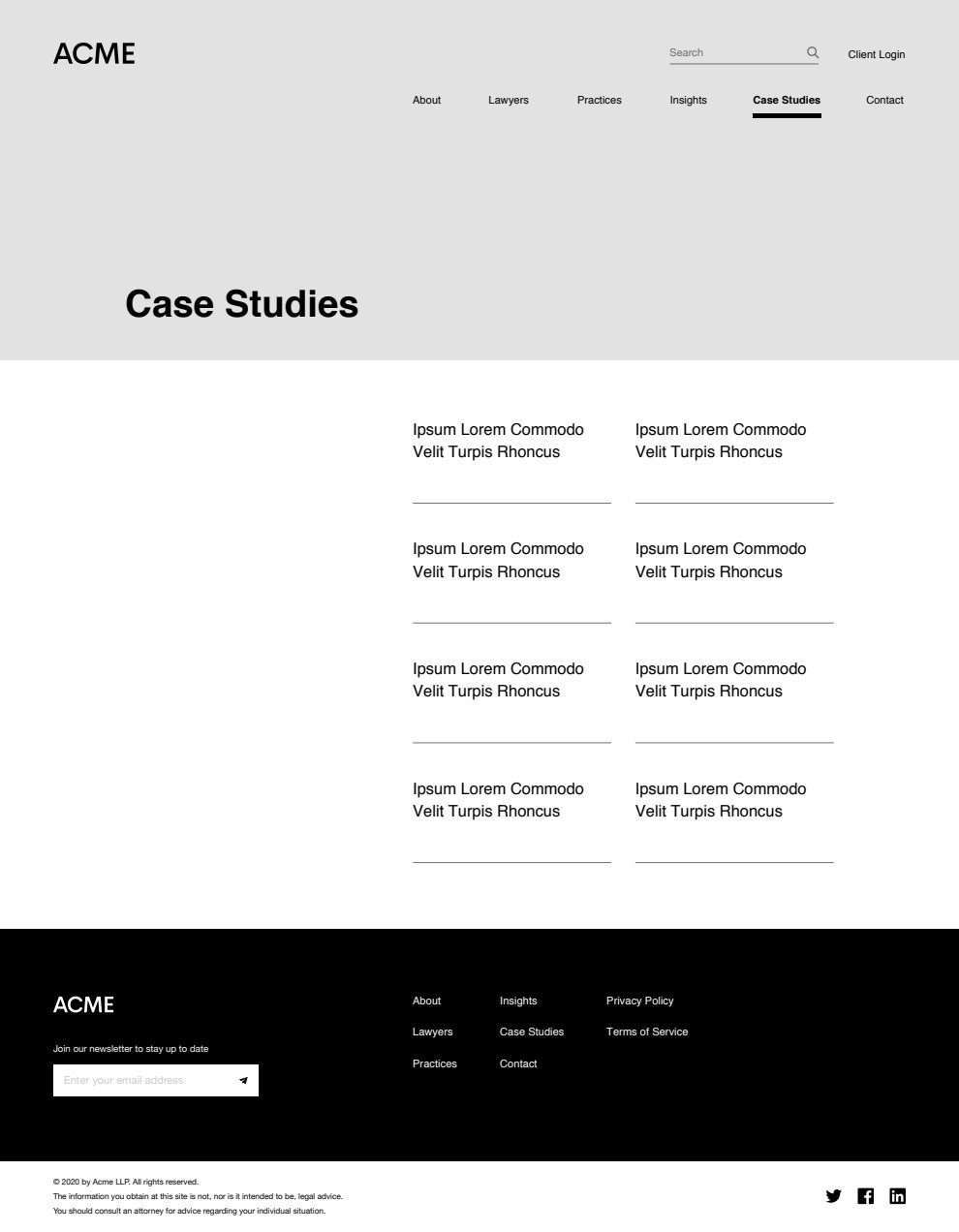 Sitemap and Wireframe process for an out of the box website product for small to midsize law firms. The idea is to provide a quality website that has baked in customization options, levels of complexity, and interchangeable pages/content.